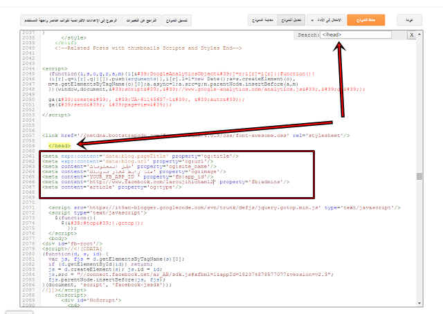 نبحث عن امر </head>  ونضع تحته الكود كما في الصورة