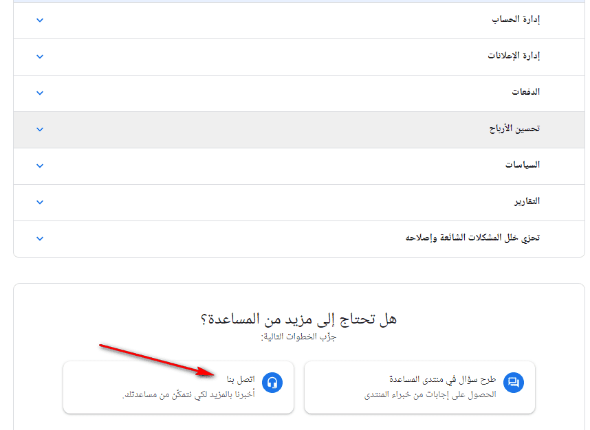 2 – العملية الثانية سوف تنقلك الى الصفحة الثانية والتي سوف تجد في الاسفل اتصل بالدعم، انت سوف تقوم بنقر على الدعم وسوف تملأ النموذج على حسب المشكلة التي تواجهك في حسابك ادسنس مثلا .