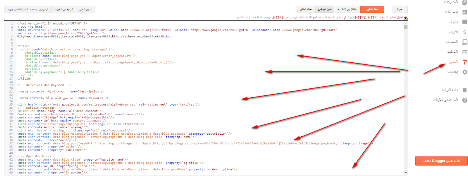 1 – ترغب في اضافة شفرة المراجعة او شفرة الاعلانات التلقائية ؟ في اعلى القالب يوجد هذا الكود <head> او تجده هكذا <head> المهم انت ركز فقط على كلمة head . ثم تضع شفرة المراجعة اسفلها مباشرة .