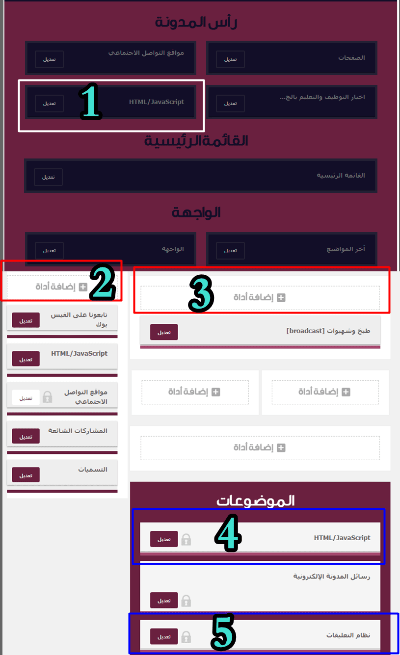 هنا سوف نبدأ بالعملية الاولى وهي المكان الاسهل لدى المبتدئين في بلوجر . سوف تقوم بالدخول الى المدونة ثم بعد ذلك سوف تجد التخطيط ، نقوم بالدخول اليها . الان وسوف نجد عدد كبير من الاضافات التي انت ربما لا تعرفها ولا داعي لذكرها في هذا الموضوع . سوف تختار اضافة اداة ثم بعدها سوف تختار html javascript ، بعدها تقوزم باضافة شفرة الاعلانات . واحيانا هذه الاداة جافا سكربت تكون موجودة بدون ان تقوم باضافتها .